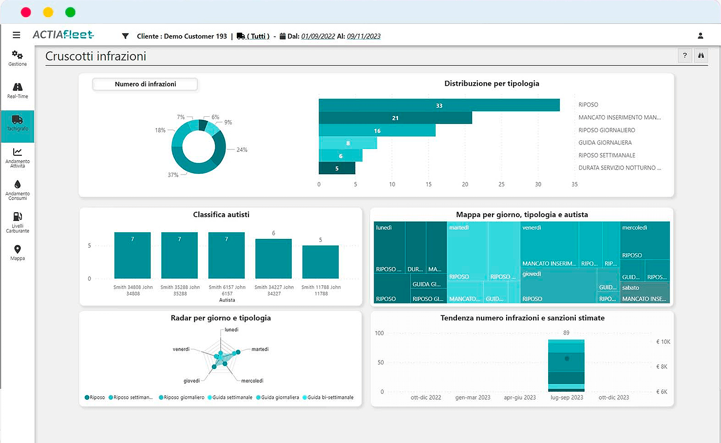 Tutte le informazioni sono archiviate su server certificati, criptate e disponibili in ogni momento per ispezioni e controlli. I file DDD e i log possono essere esportati con un clic. Nessun rischio di perdita, massima sicurezza e conformità garantita.
